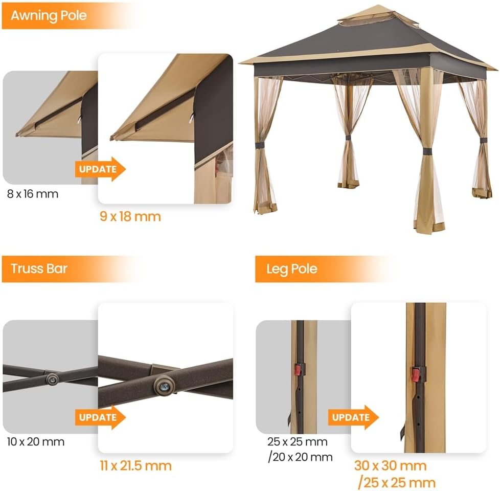 With a spacious 11×11 size, this pop-up gazebo offers ample room for relaxing, entertaining, or dining outdoors. The 2-tier roof design adds a touch of elegance while providing extra ventilation to keep you cool on sunny days. The included mesh netting helps to keep bugs and insects at bay, allowing you to enjoy the outdoors without any unwanted visitors.